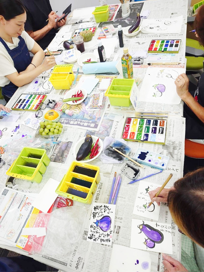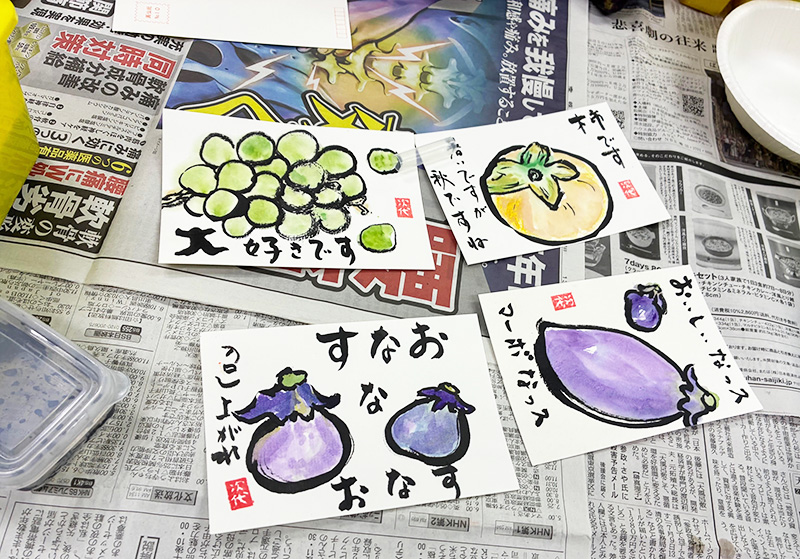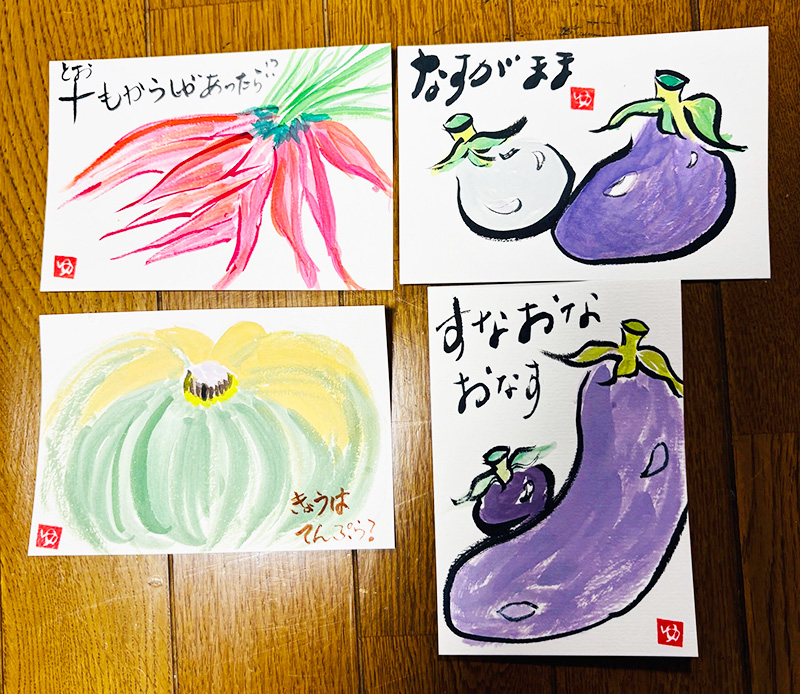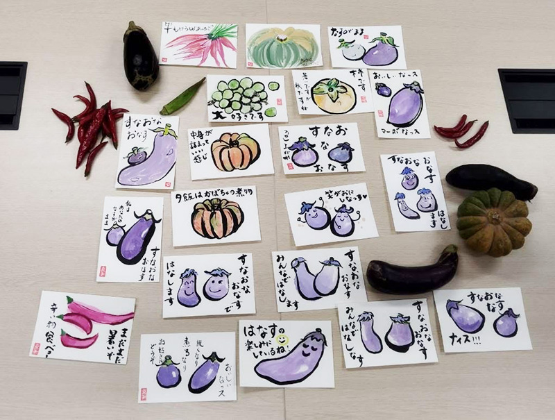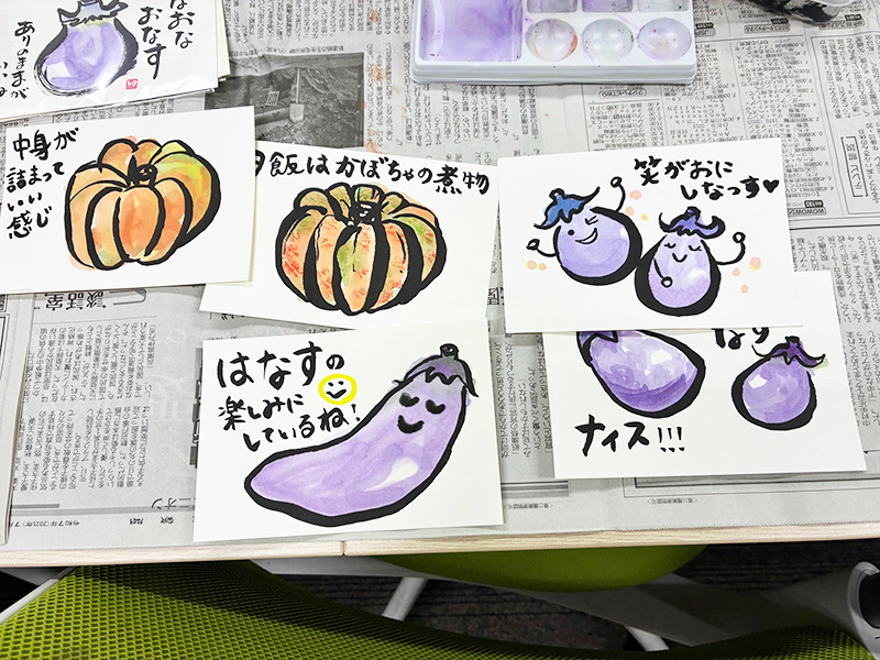 線は単調ではなく変化があり、色の配色も素晴らしく、ナスの発色が見事な笑手紙たちです。